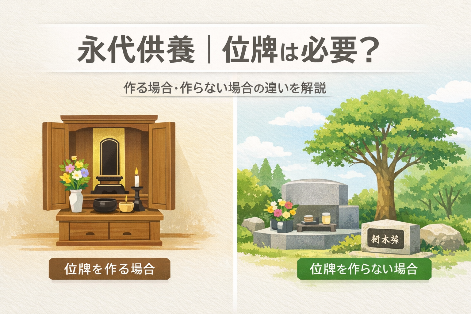 近年、少子高齢化やライフスタイルの変化に伴い 「永代供養」 を選ぶ人が急増しています。一方で悩ましいのが、位牌を 作るか・作らないか。位牌は伝統的に故人の魂の依代(よりしろ)とされますが、永代供養では必須ではありません。本記事では 費用・手間・心情 の 3 つの観点で両者を比較し、後悔しない選択ポイントを解説します。