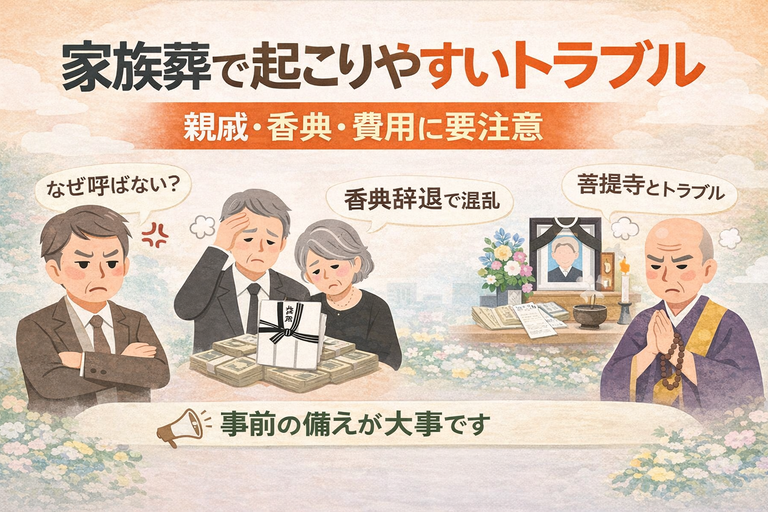 この記事では、家族葬で起こりやすい代表的なトラブル事例と、その対策についてわかりやすく解説します。