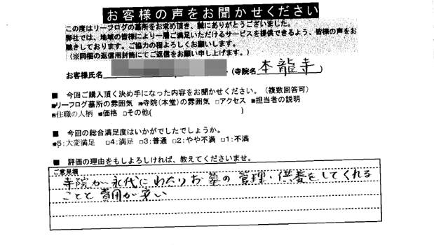 自宅からも近く住職様にもお会いして親しみやすく管理の手間もなく子供たちに迷惑を…